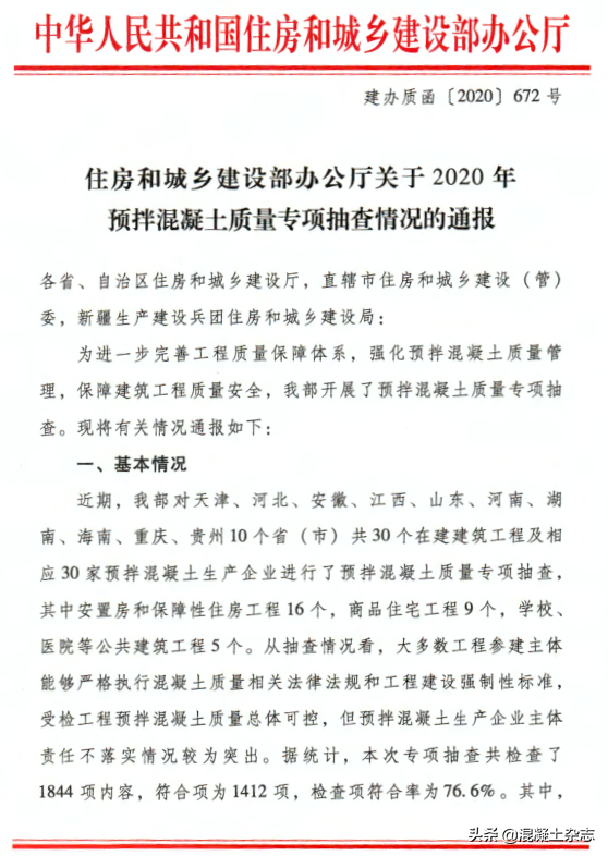 住建部关于2020年预拌混凝土质量专项抽查情况的通报