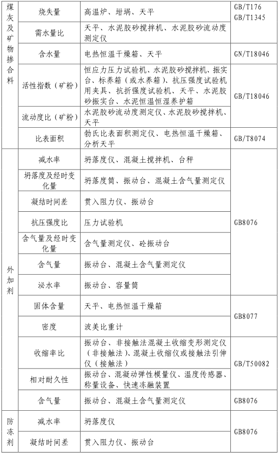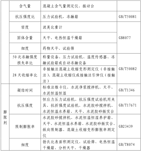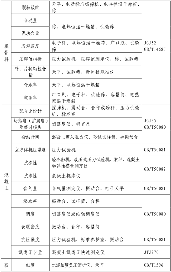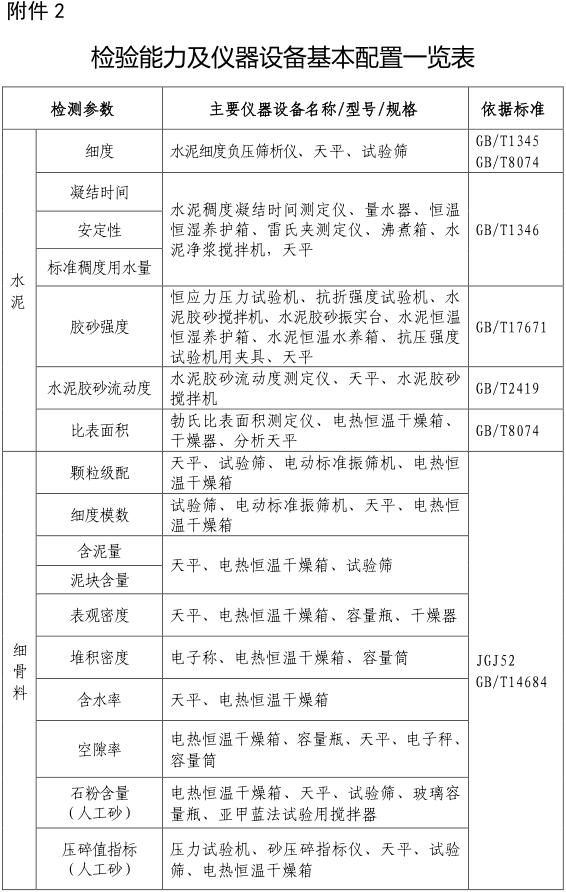 (一)试验室的检验能力应与预拌混凝土企业的生产能力相适应。试验室根据生产需要进行项目检验,按照《检验能力及仪器设备基本配置一览表》(附件2)配备相应的仪器设备。