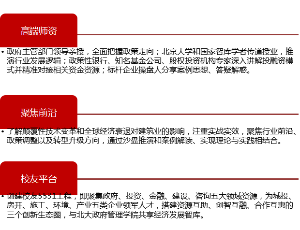北京大学建筑业创新发展领军人才研修班,旨在帮助建筑业企业领袖把握国内外机遇、前沿技术变革、制定企业发展战略、加强组织建设、提升创新能力、打造竞争优势、夯实管理实务,助力转型升级高质量发展。