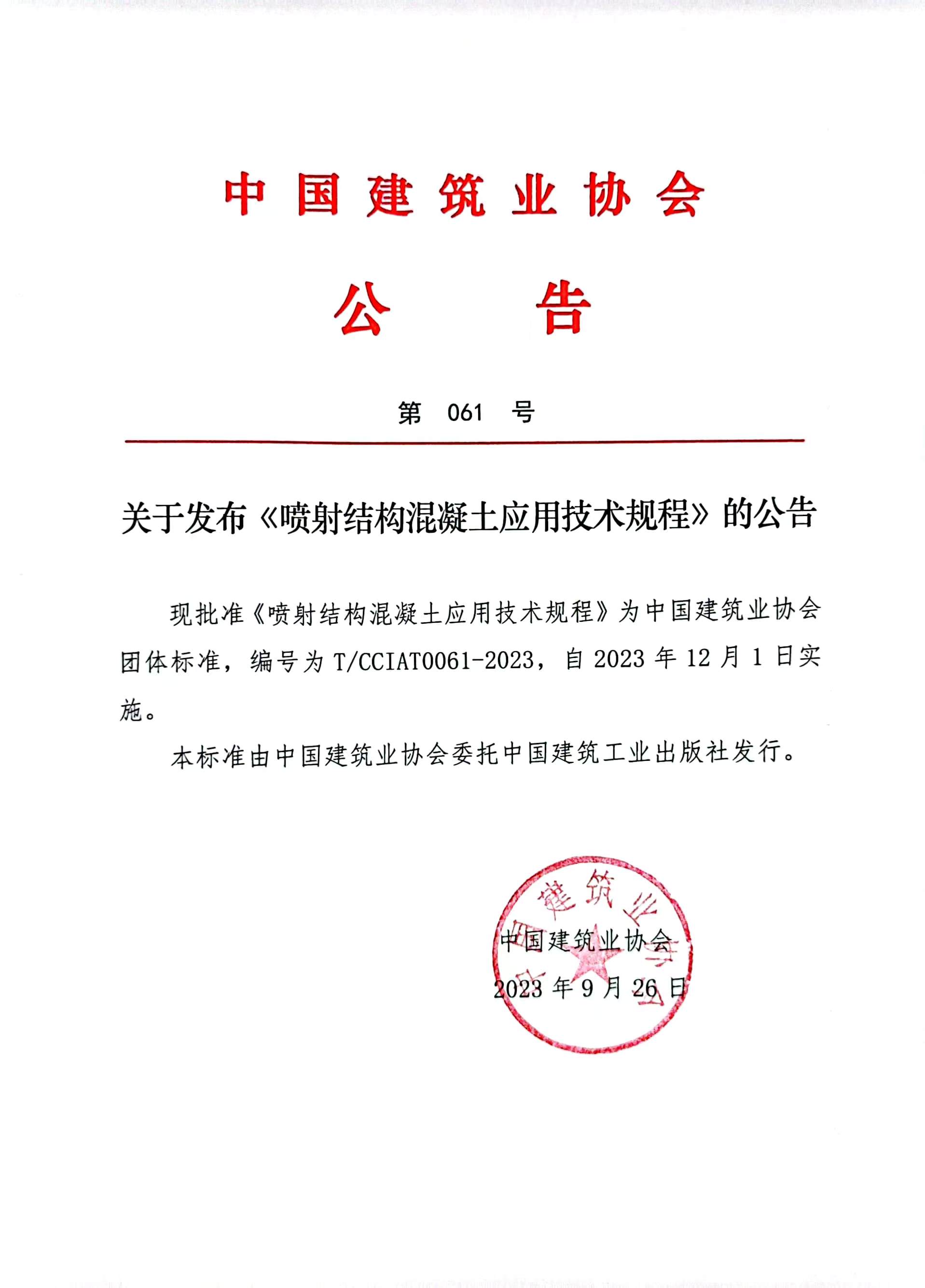 关于发布《喷射结构混凝土应用技术规程》的公告