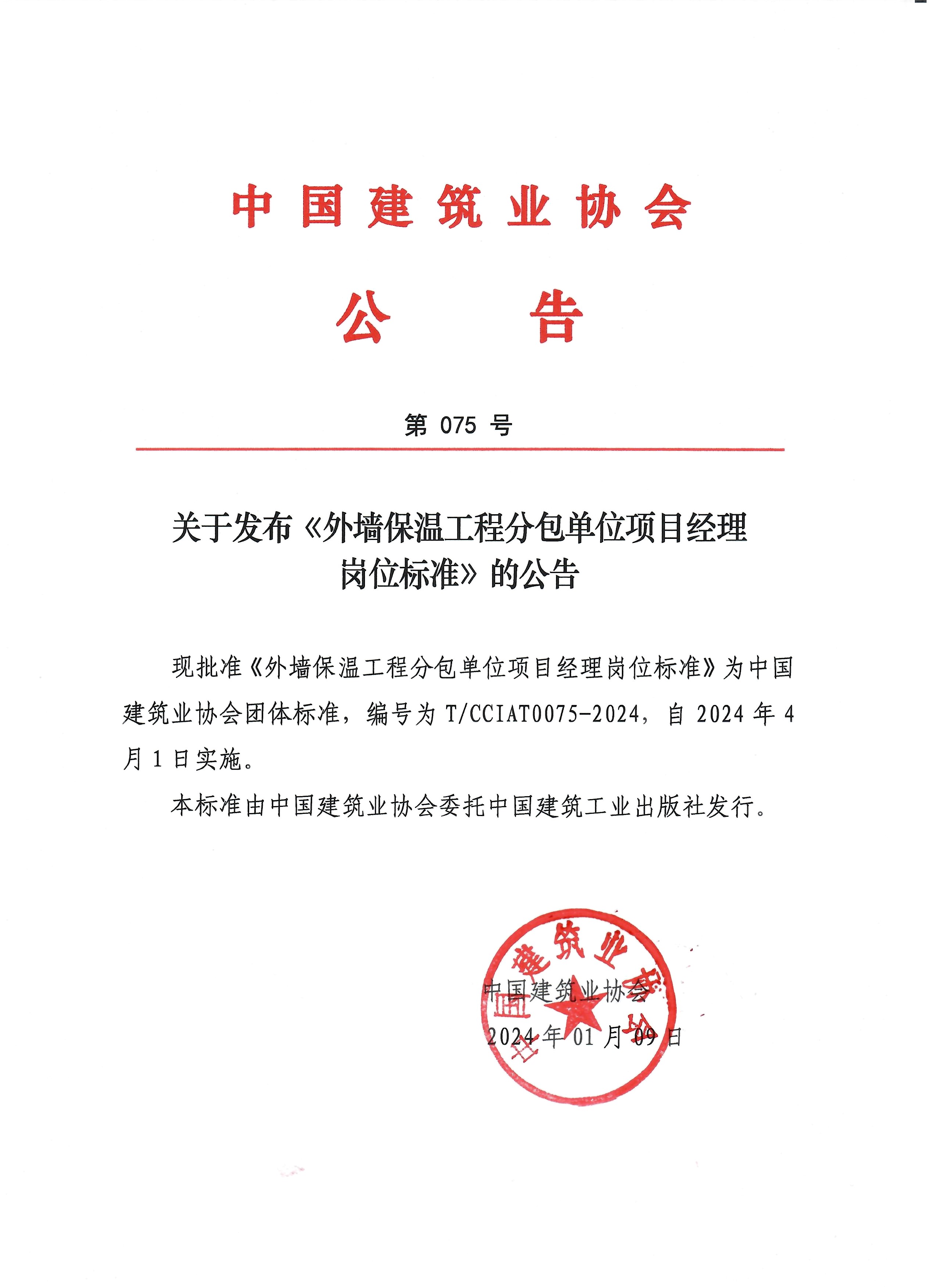 关于发布《外墙保温工程分包单位项目经理岗位标准》的公告