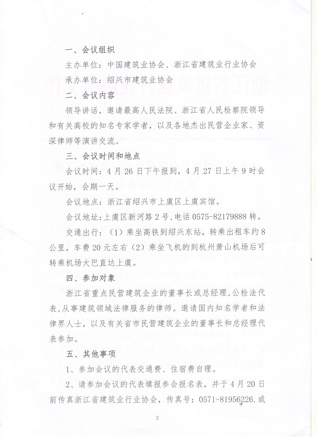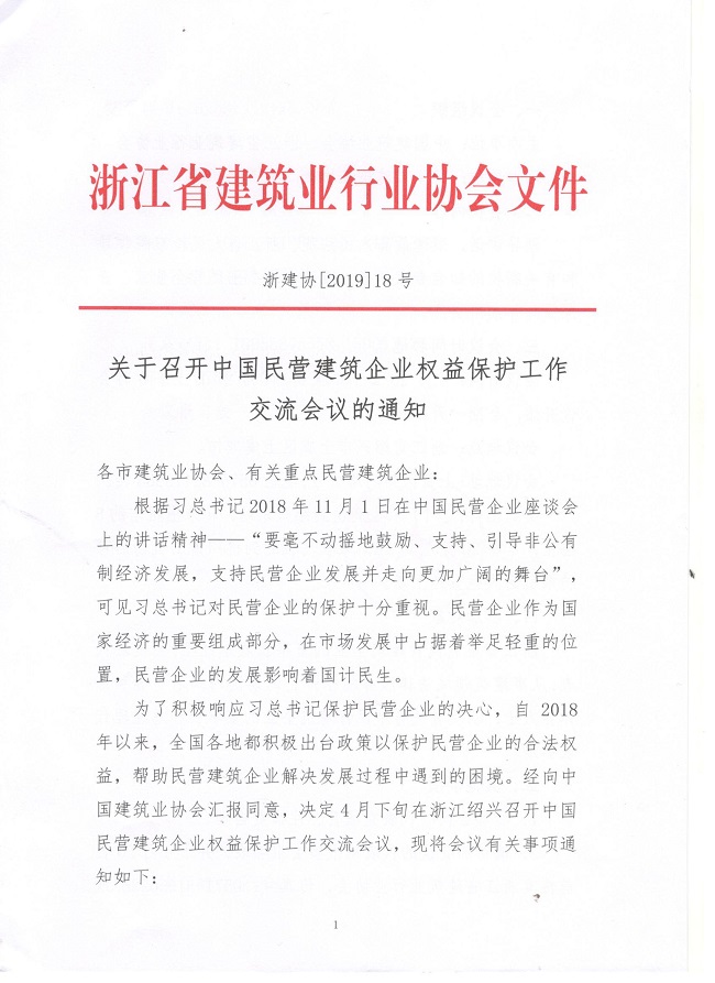 为全面贯彻习近平总书记在民营企业座谈会上的重要讲话精神,贯彻落实党中央、国务院支持民营企业改革发展的决策部署,支持和推动民营建筑企业发展,我会决定与浙江省建筑业行业协会在浙江绍兴联合召开中国民营建筑企业权益保护工作交流会,深入研究民营建筑企业发展过程中遇到的困难和问题,切实维护企业合法权益,大力支持民营建筑企业发展壮大。请贵协会推荐本地区或本行业两到三家民营企业参会(每家不超过2人)。会议安排详见附件。