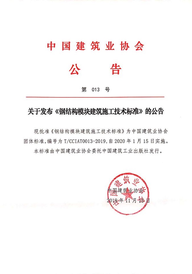 关于发布《钢结构模块建筑施工技术标准》的公告