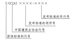 第十九条 团体标准的编号由团体标准的代号(T/)、中国建筑业协会代号(CCIAT)、发布标准的顺序号和发布标准的年代号组成,并应符合下列统一格式: