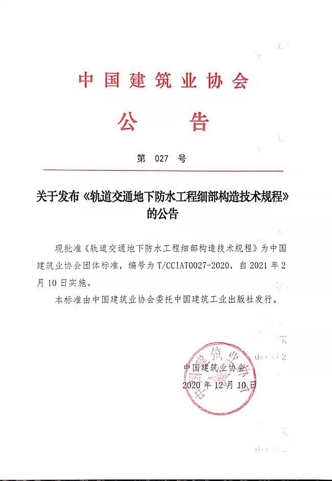 关于发布《轨道交通地下防水工程细部构造技术规程》的公告