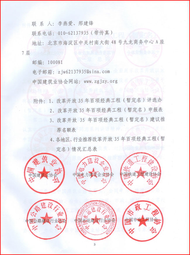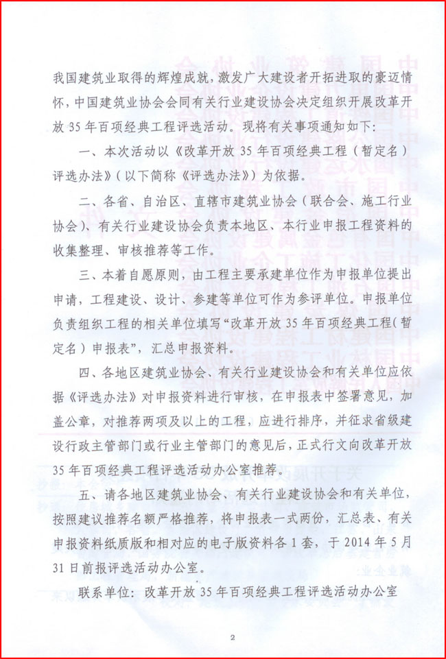 第四条 由中国建筑业协会牵头,会同电力、铁道、公路、水运、化工、石油、冶金、有色、煤炭、市政、建材、林业等行业建设协会和解放军工程建设协会共同组成“改革开放35年百项经典工程”评选活动组委会(以下简称组委会)。组委会下设办公室,办公室设在中国建筑业协会建筑工程技术专家委员会,负责具体事务工作。