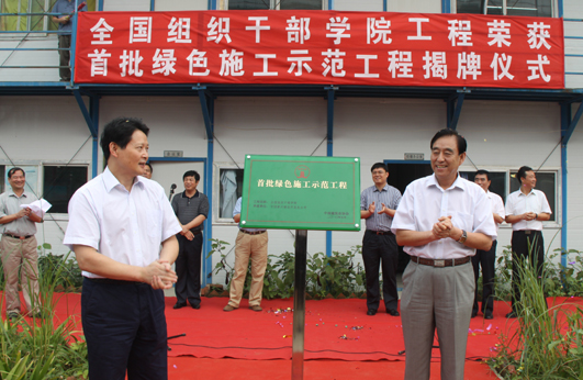全国组织干部学院工程是中国建筑业协会确定的全国首批绿色施工示范工程之一。8月24日上午10时,在中国新兴建设开发总公司一公司承建的该工程施工现场,举行了隆重的揭牌仪式。中组部副部长李智勇、全国组织干部学院院长袁治平、中组部机关事务管理局副局长张忠、全国组织干部学院副院长刘亚军、中国新兴集团总经理于敦才、中国新兴建设开发总公司总经理魏军和一公司总经理贾玉斌等领导出席了仪式。仪式由全国组织干部学院工程基建办主任郑礼勤主持,李智勇部长、于敦才总经理为全国组织干部学院荣获首批绿色施工示范工程揭牌。