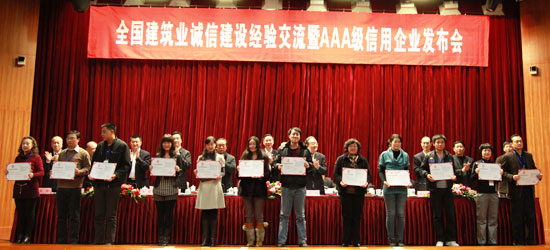 1月17日,中国建筑业协会在京召开建筑业企业诚信建设经验交流暨第二批建筑业AAA级信用企业发布会。北京城建集团有限责任公司等114家建筑业企业荣获2010年度“全国建筑业AAA级信用企业”称号。