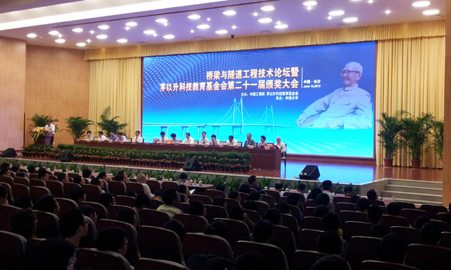 由中国工程院、茅以升科技教育基金会共同主办的桥梁与隧道工程技术论坛暨茅以升科技教育基金会第二十一届颁奖大会,6月16日在中南大学举行。全国政协副主席、九三学社中央副主席、中国科学院院士、基金会主任王志珍,全国政协常委、铁道部原副部长、中国工程院院士孙永福,湖南省政协副主席张大方,铁道部原总工程师、基金会常务副主任王麟书,原建设部党组成员、基金会副主任姚兵,交通运输部原总工程师、基金会副主任凤懋润,北京交通大学教授、中国工程院院士、基金会副主任王梦恕,中南大学党委书记高文兵,中国建筑业协会副会长兼秘书长吴涛,全国政协委员、茅以升基金会秘书长茅玉麟等700余人出席大会。