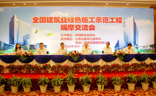为进一步促进建筑业发展方式转变,建设资源节约型、环境友好型社会,加强和促进建筑业节能减排与绿色施工,中国建筑业协会根据郑一军会长关于“协会要把加强和促进建筑节能减排和绿色施工作为今明两年工作的重中之重,抓住不放,抓出成效”的指示,自2010年起,在行业内率先开展绿色施工示范工程创建活动。两年来,已有两批共93项工程被列为全国建筑业绿色施工示范工程。为交流创建全国建筑业绿色施工示范工程经验,发挥示范工程的集聚辐射带动作用, 10月11-12日,中国建筑业协会在苏州举办了全国建筑业绿色施工示范工程观摩交流会,并发布了《全国建筑业绿色施工示范工程申报与验收指南》。中国建筑业协会副会长兼秘书长吴涛、江苏省建筑行业协会会长高学斌出席会议并讲话。会议由中建协副秘书长刘宇林主持。本次观摩交流会得到了江苏省建筑行业协会和苏州二建建筑集团有限公司的大力支持,来自全国建筑业企业和相关行业协会的代表千余人参会,规模空前。