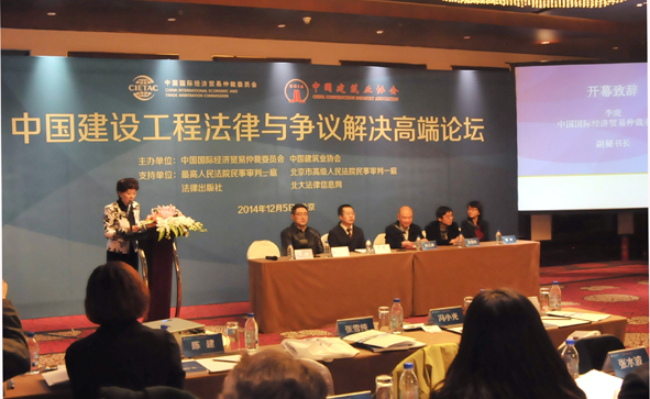 为增强我国工程承包企业应对建设领域法律风险的能力,提高企业应对和解决合同纠纷与争议的水平,增进工程建设界和法律界的交流,中国国际经济贸易仲裁委员会和中国建筑业协会于2014年12月5日在北京联合举办“中国建设工程法律与争议解决高端论坛”。中国国际经济贸易仲裁委员会副秘书长李虎、中国建筑业协会副会长徐义屏出席论坛并致辞。来自司法机关、仲裁机构和工程建设企业的代表以及相关专家、学者200多人参加了高端论坛。