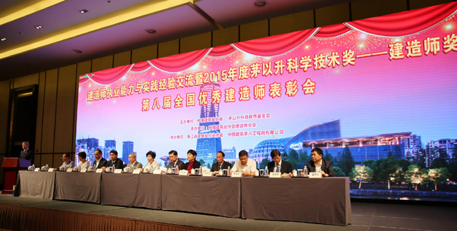 10月11日-12日,“建造师执业能力与实践经验交流暨2015年度茅以升科技奖——建造师奖、第八届全国优秀建造师表彰大会”在杭州召开。第十一届全国政协副主席、茅以升科技教育基金会主任委员王志珍;中国建筑业协会会长、住建部科技委副主任王铁宏;浙江省政协原副主席冯恩培;中建协建造师分会会长刘龙华;浙江省建筑业行业协会副会长兼秘书长姚光恒;茅以升科教基金会秘书长茅玉麟;中建八局副局长韩兴争;中天建设集团董事长楼永良;中建协副秘书长王秀兰等,与来自全国各地的400多位获奖者代表、行业协会及有关方面领导、企业界代表出席了这次会议。会议由中建协建造师分会秘书长肖星主持。