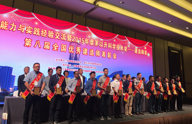 会上,茅玉麟介绍了由中国建筑业协会和茅以升科教基金会联合开展的“2015年度茅以升科技奖——建造师奖” 的评选情况。王秀兰宣读了中建协建造师分会“关于‘表彰第八届全国优秀建造师’的决定”。95名荣获“2015年度茅以升科技奖——建造师奖”和375名荣获“第八届全国优秀建造师”荣誉称号的部分代表上台受奖。