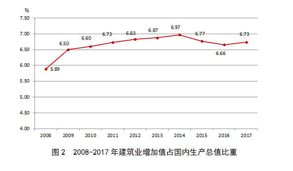 自2009年以来,建筑业增加值占国内生产总值的比例始终保持在6.5%以上。2017年在上年下降的情况下出现回升,达到了6.73%的较高点(图2),建筑业国民经济支柱产业的地位稳固。
