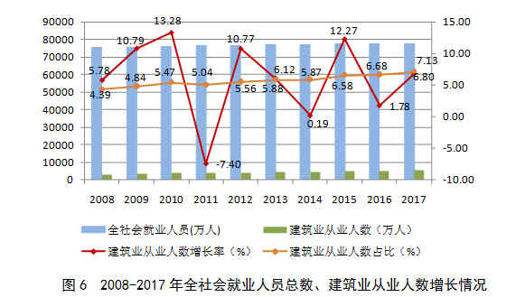 2017年底,全社会就业人员总数77640万人,其中,建筑业从业人数5536.90万人,比上年末增加352.36万人,增长6.80%。建筑业从业人数占全社会就业人员总数的7.13%,比上年提高0. 45个百分点,占比再创新高(图6)。建筑业在吸纳农村转移人口就业、推进新型城镇化建设和维护社会稳定等方面继续发挥显著作用。