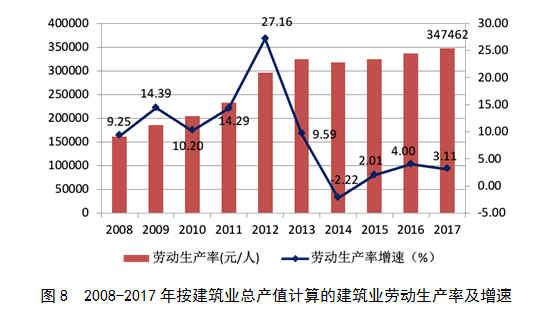 2017年,按建筑业总产值计算的劳动生产率为347462元/人,比上年增长3.11%,增速虽略有下降,但劳动生产率水平创出新高(图8)。