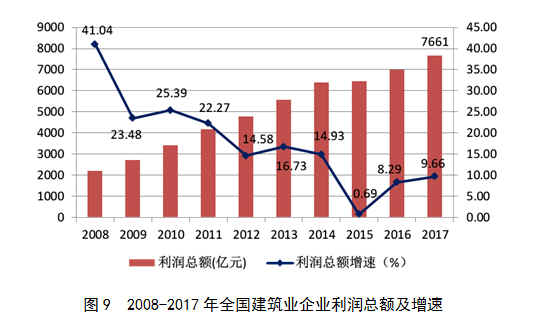 2017年,全国建筑业企业实现利润7661亿元,比上年增加674.95亿元,增速为9.66%,增速比上年高1.37个百分点(图9)。