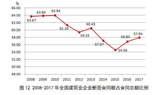 2017年,全国建筑业企业签订合同总额439524.36亿元,比上年增长18.10%,增速连续两年增长。其中,本年新签合同额254665.71亿元,比上年增长了20.41%,增速也连续两年保持增长(图11)。本年新签合同额占签订合同总额比例为57.94%,比上年提高了1.11个百分点,连续两年出现增长(图12)。