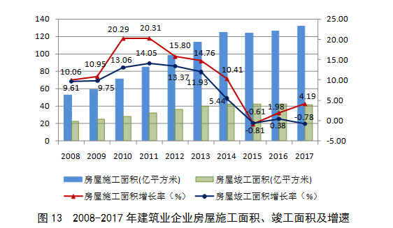 2017年,全国建筑业企业房屋施工面积131.72亿平方米,比上年增长4.19%,增速连持续两年保持增长。竣工面积41.91亿平方米,比上年下降0.78%(图13)。
