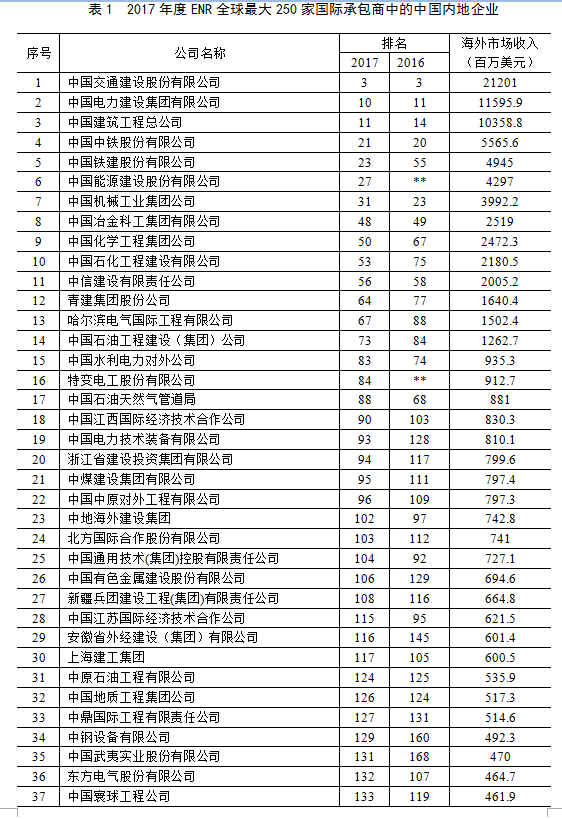 美国《工程新闻记录》(简称“ENR”)杂志公布的2017年度全球最大250家国际承包商共实现营业收入4681.2亿美元,比上一年度下降了6.4%,下滑的态势已经持续了三年,且降幅有了明显的扩大。我国内地共有65家企业入选2017年度全球最大250家国际承包商榜单,入选数量与上年持平。入选企业共实现海外市场营业收入987.2亿美元,比上年增长了5.4%,占250家国际承包商场营业收入总额的21.1 %,比上年提高1.8个百分点。