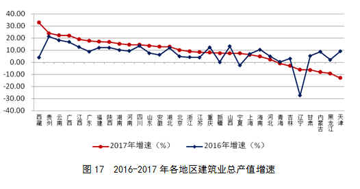 从各地区建筑业总产值增长情况看,有24个地区的建筑业总产值增长,20个地区的增速高于上年。西藏、贵州、云南和广西分别以32.93%、24.12%、22.22%和22.06 %的增速位居前四位。7个地区的建筑业总产值出现负增长,其中,天津、黑龙江、内蒙古出现了低于-8%的负增长,分别为-12.87%、-9.12%和-8.08%(图17)。