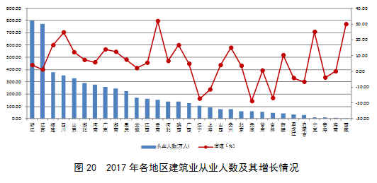 2017年,全国建筑业从业人数超过百万的地区共17个,比上年减少1个。浙江、江苏依然是从业人数大省,人数分别达到880.84万人、772.75万人。福建、四川、山东、湖北、河南、广东、湖南、重庆等8个地区从业人数均超过200万人,分别为379.36万人、352.83万人、328.71万人、289.19 万人、275.84万人、260.40万人、247.25万人和224.64万人。与上年相比,23个地区的从业人数增加,其中,增加人数最多的是四川,增加69.96万人;海南从业人数与上年持平;7个地区的从业人数减少,其中,辽宁、天津、上海3个地区减少的人数均超过10万人。从业人数增速超过20%的有云南、西藏、宁夏、四川4个地区,增速分别为31.89%、29.93%、25.08%和24.73 %;天津、辽宁、吉林、上海4个地区的降幅均超过10%(图20)。