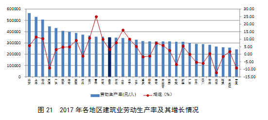 2017年,按建筑业总产值计算的劳动生产率排序前三位的地区是北京、上海和湖北。北京自2012年来连续6年领跑全国,2017年劳动生产率为564242元/人,比上年增长5.69%;上海2017年劳动生产率为532485元/人,比上年增长了11.40%;湖北2017年劳动生产率为506235元/人,比上年增长了10.34%。20个地区按建筑业总产值计算的劳动生产率有所提高,11个地区有所降低。增速超过10%的有吉林、山西、上海、贵州、湖北和辽宁6个地区(图21)。