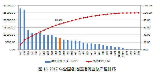 除苏、浙两省外,总产值超过7500亿元的还有湖北、山东、四川、广东、河南、福建、北京、湖南和重庆9个地区,上述11省市完成的建筑业总产值占全国建筑业总产值的69.49%(图16)。