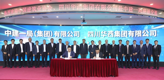 中建一局党委书记、董事长罗世威,四川华西集团党委书记、董事长杨斌,中国建筑业协会会长齐骥,副会长兼秘书长刘锦章见证签约。