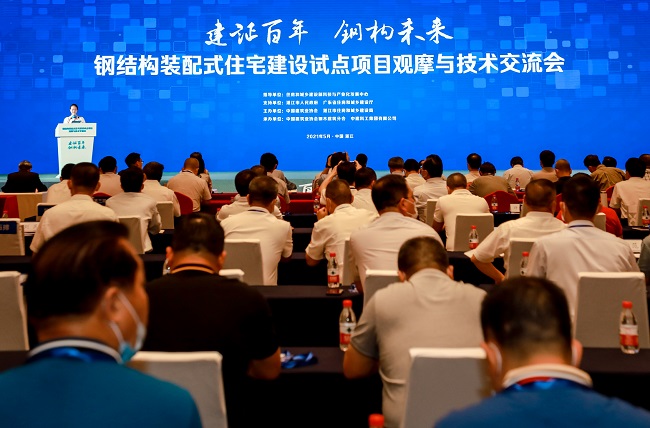 5月24日,由中国建筑业协会、湛江市住房和城乡建设局主办,中国建筑业协会钢木建筑分会、中建科工集团有限公司承办的钢结构装配式住宅建设试点项目观摩及技术交流会在湛江市举行。中国建筑业协会会长齐骥,住建部总工程师李如生,中国工程院院士周绪红、肖绪文,住建部建筑市场监管司副司长廖玉平,住建部科技与产业化发展中心副主任陈伟,中国建筑业协会副会长兼秘书长刘锦章,广东省住建厅党组成员、总工程师陈天翼,湛江市人民政府副市长陈伟杰,中建科工集团有限公司董事长、钢木建筑分会会长王宏等领导专家出席大会。钢结构建筑领域相关政府机构、专家学者、企业代表等共计340余人现场参会。
