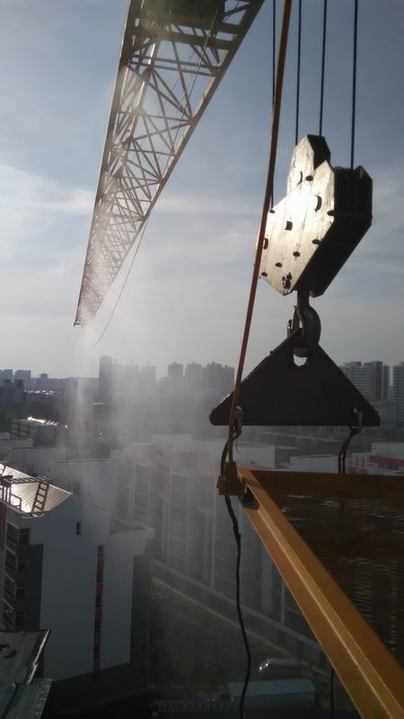 这座塔吊式喷淋设施是怎么工作的呢?该项目的管理人员告诉记者,这一提议来自市安监站领导,工作原理是将水管放置于塔身、塔臂的内侧,再在塔臂的横向水管上设置若干个喷头,通过加压设备将水输送到水管里,水通过喷头再喷射出来,从而达到为工地降尘的目的。此举不仅节约了水资源,还可以通过塔臂的移动实现空中和地面全面降尘的目的,弥补普通的降尘方式只能起到地面降尘效果的缺陷。据悉,该项目部每天早、中、晚都会对工地进行高空喷洒降尘,大气污染严重时,还加密喷洒频次。