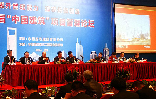2011年1月6日至7日,由中国建筑股份有限公司组织的以“提升管理能力,追求价值创造”为主题的第二届“中国建筑”项目管理论坛在深圳成功举办。中国建筑业协会副会长兼秘书长吴涛,中建总公司董事长、党组书记易军,深圳市委常委、常务副市长吕锐锋,中建股份副总裁王祥明,深圳市住房和建设局副局长胡建文,英国皇家特许建造学会(CIOB)全球主席李世蓉等领导出席了论坛。中国建筑股份公司相关部门、各工程局有关负责人、部分优秀项目经理等近200人参加了论坛。