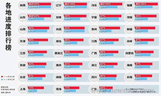 其中,开工率超过100%的有5省,分别是河北、辽宁、福建、山东、陕西.此外,还有14个地方开工率超过全国平均水平或与全国平均水平持平,分别是:甘肃98%、宁夏97%、河南96%、山西94%、贵州92%、新疆生产建设兵团92%、新疆维吾尔自治区91%、天津90%、湖北88%、吉林87%、江西87%、黑龙江86%、江苏86%、广西86%.
