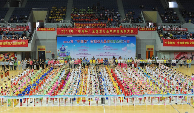 此次表演大会由中国关心下一代工作委员会、中国宋庆龄基金会、中国体操协会等联合主办,由中南控股集团有限公司、中南建设产业集团和中国关心下一代工作委员会幼儿基本体操促进会承办。来自全国14个省、市、自治区及各行业体协的46个基层幼儿园代表队,以及特邀嘉宾泰国代表队的500余名小朋友参加了此次表演,大会共分自编幼儿基本体操、自编幼儿轻器械基本体操和蹦床三组。 (中南建设产业集团 王伦成)