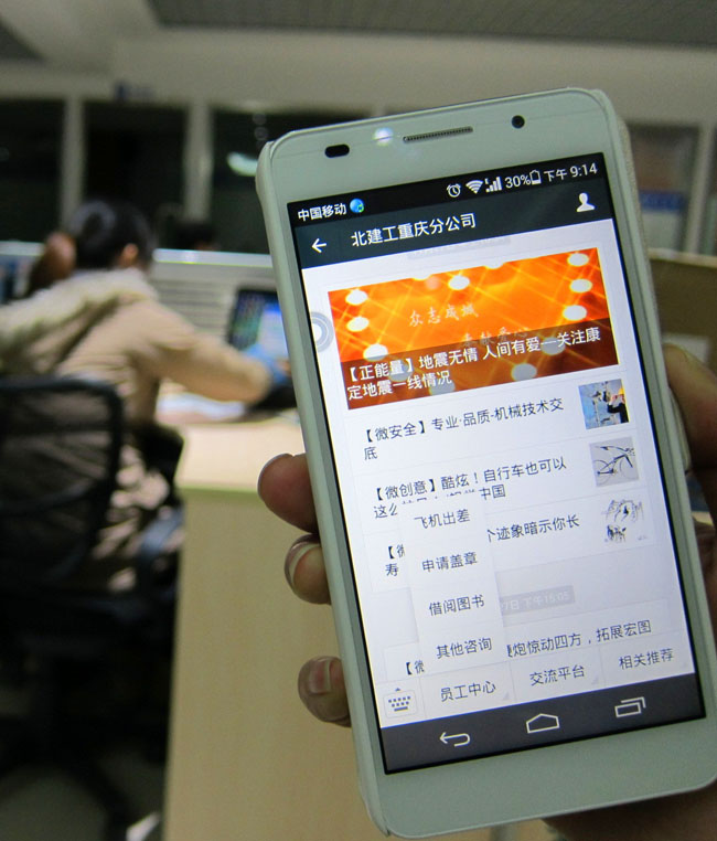 近日,北京建工四建重庆分公司官方微信、微博上线试运行,员工审批在手机微信平台上就能完成。