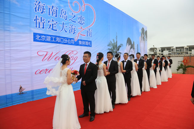 说起举办这次集体婚礼的初衷,北京建工四建海南分公司经理刘磊介绍“四建公司自2009年进入海南市场,从一个项目部,30多名员工,一步步发展到今天,8个整建制项目部,307名员工,18项在施工程,总建筑面积超260万平方米。其中青年职工201人,占到职工总数的67%,尤其是2009-2010年进入海南时期的青年员工,现如今均已到成家立业的年龄,他们是北京建工在海南发展的排头兵,他们将自己6年的青春贡献给了海口国兴大道两侧的建筑物,留下了‘国兴大道建工街’的美名。分公司领导班子感念青年人的无悔付出,集体决定为他们组织一场难忘的集体婚礼,以增加青年职工的企业归属感,建立员工‘爱家就是爱企业,爱企业就是爱家’的企业认同感。”