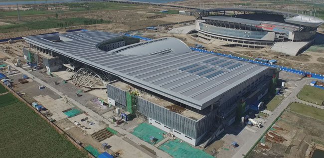 河北奥林匹克体育中心体育馆综合体金属屋面工程包括体育馆、游泳馆、网球中心及综合训练馆三部分,建筑高度为29.8米,总面积达2.9万平方米,历时60天安装完成。工程施工过程中,项目部采用先进的管理方法,积极应用新型技术,强化过程管控,克服了超长铝镁锰板材上料、大面积金属屋面板抗风件安装和复杂流水施工协调控制等诸多难题,有效提高了整个金属屋面工程的施工质量和安装效率。