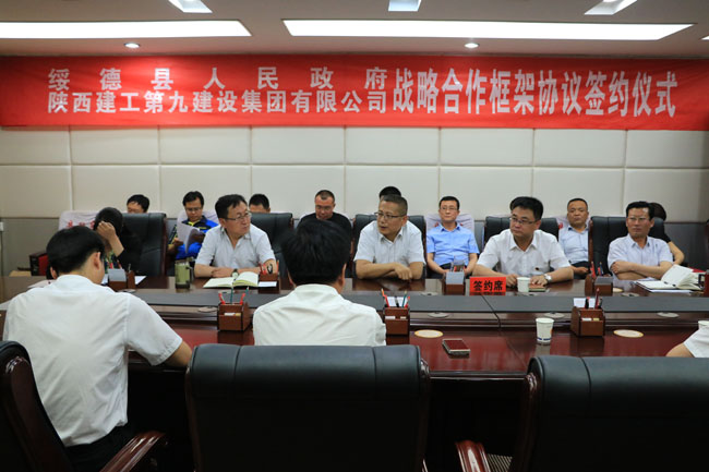 签约仪式上,姬跃飞首先对陕建九建集团来绥座谈交流、考察建设投资表示欢迎,并就集团对绥德经济社会发展的大力支持表示感谢。他说,当前绥德县正处于经济总量大步跃升的关键期、产业结构调整的转型期、基础设施建设的潜能释放期、城乡居民的民生普惠期,许多领域亟待开发和建设。陕建九建集团作为国内知名、省内一流、榆林第一的建筑施工企业,人才、技术、资金等实力雄厚,在业界具有良好口碑,绥德需要集团这样的名优大型国有企业参与经济建设,他表示,绥德将以此次战略合作为契机,抢抓机遇,乘势而上,携手共进,祝愿双方早结合作硕果。