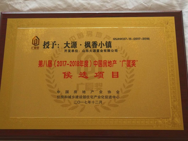 近日,从全国一级资质房地产开发企业座谈会上获悉,由中国房地产业协会和住房和城乡建设部住宅产业化促进中心组织的第八届(2017—2018年度)中国房地产"广厦奖"候选项目中,山东大源集团开发的大源枫香小镇项目榜上有名,被评为国家房地产开发“广厦奖”候选项目。