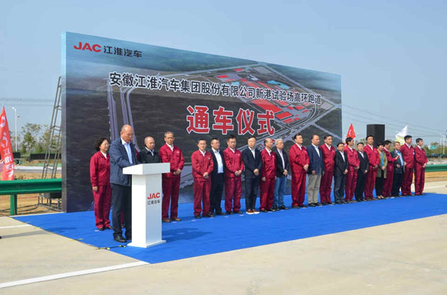 10月18日,中交一公局集团施工的安徽江淮汽车试验场高速环道工程建成通车并投入使用,这是我国整车试验场首个三圆弧高环跑道,对国内汽车试验场建设具有重要的借鉴作用。江淮汽车集团公司党委书记、董事长安进、中国汽车试验场协会秘书长杨瑞峰、一公局集团副总经理刘其亮、五公司党委书记、执行董事马骏等相关领导出席通车仪式,设计单位、监理单位、施工单位部分代表参加仪式。江淮汽车党委副书记王东生主持通车仪式。