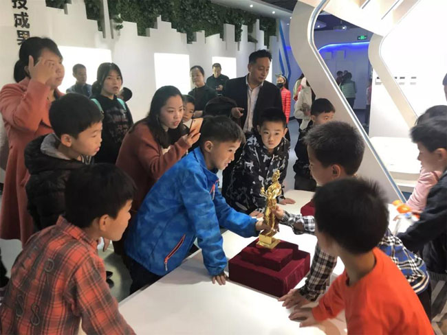 展厅里还有各种建造楼房需要的工具,工作人员一一介绍给小记者,孩子们看着这些有的认识有的不认识工具,都很兴奋。在展厅内,其中有一面墙全部都是菏建集团获得的各种奖项奖杯,小记者们纷纷拿起手中的相机手机拍照留念。“孩子们一定都知道大剧院吧,这个小金人就是由菏建集团承建的菏泽大剧院荣获中国建设工程‘鲁班奖’奖杯。”讲解员对孩子们说。据了解,“鲁班奖”是中国建筑业最高奖,被誉为“中国建筑界的奥斯卡”,由住房和城乡建设部与中国建筑业协会组织国家级专家进行评选。