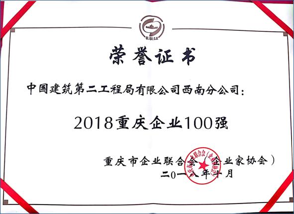 10月26日,重庆市企业联合会发布了“2018重庆企业100强”、“2018重庆制造业企业100强”、“2018重庆服务业企业100强”排行榜。中国建筑第二工程局有限公司西南分公司以2017年度128亿元的营业收入跻身榜单第37名。