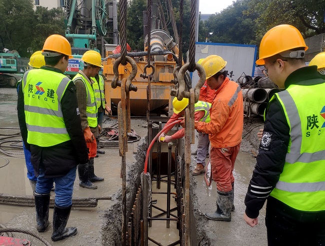 地下分项工程体量大,工期紧,质量要求高。支护、桩基、土方等工程造价已达1亿多元,仅连续墙、桩基、钢筋砼支撑的钢材用量就达5000多吨,混凝土用量约为30000多立方米。基坑支护采用两墙合一地下连续墙,厚度为1000毫米和800毫米,成槽深度可达50余米,在武汉地区极为少见。每幅钢筋笼长达50米(约15层楼高),单幅钢筋笼重量约52吨。其中地下连续墙混凝土强度等级为水下C35P10,具有水下不分离、自密实性、低泌水性和缓凝等特点,这对成槽后混凝土限时浇筑要求非常严格,且地连墙仅上部28米进行了三轴搅拌桩加固,下部易发生塌孔。项目部管理人员自行研制了深处泥浆取样器,更客观、便捷地检测了深处泥浆指标,施工过程中未发生塌孔现象。地下连续墙原设计74幅,经项目部研究后和设计单位沟通,优化为70幅,钢筋笼两次吊装拼接改为一次性整体吊装。不仅有效保障施工安全也提升了施工效率,节约建设成本20余万元,取得双赢的效果。最终,70幅地连墙历时122天全部顺利完工,比原计划提前25天。