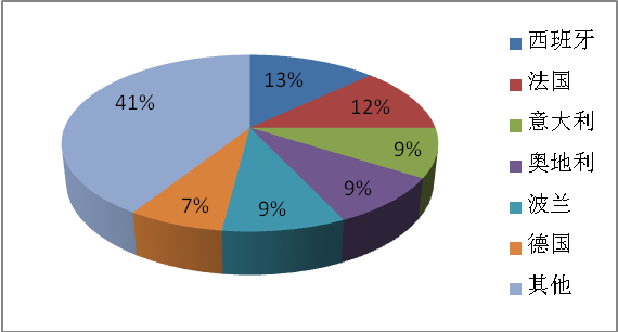 欧盟内部既拥有多元化的建筑巨头,也包含一些规模较小的承包商,这体现出整个欧盟承包商结构成熟、产能规模可观。由于欧盟承包商实力强大,欧盟90%的项目由自己的承包商占据。其中西班牙和法国承包商占比超过25%,意大利、奥地利和波兰的承包商也承担了大量建筑项目。欧盟以外的承包商以瑞士、美国和英国为主,大概承担3%的项目。