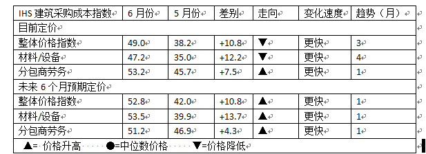 根据埃信华迈公司和采购执行小组数据,建筑工程成本6月份下滑,6月份的建筑工程采购指数位于49.0,略低于50的中位值。本月建筑材料和设备采购指数处于47.2,表明价格略有下跌,分包商指数位于53.2,稍有上升。