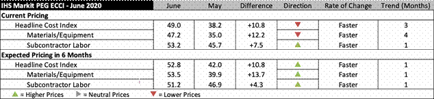 NEW YORK (June 24, 2020) – Engineering and Construction costs fell in June, according to IHS Markit (NYSE: INFO) and the Procurement Executives Group (PEG). The current headline IHS Markit PEG Engineering and Construction Cost Index registered 49.0 in June, falling just short of the neutral mark 50; a neutral index reading indicates responders see no change in pricing. The materials and equipment portion of the index came in at 47.2, still indicating falling prices, while the sub-contractor portion came in at 53.2, signaling rising costs.