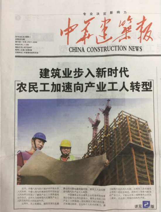 日前,《中国建设报》建筑半月谈8月31日专版聚焦“推进建筑劳务用工制度改革,培育现代化建筑产业工人”。在头条位置刊登了我会副会长兼秘书长邢作国的文章《加快培育新时期建筑产业工人队伍》,以及我会理事唐新球等同志的文章《政企合力促转型创新平台引发展》。《中华建筑报》8月28日以《建筑业步入新时代 农民工加速向建筑产业工人转型》为题在头版头条和第二版显要位置刊登了采访我会负责人的专题报道。
