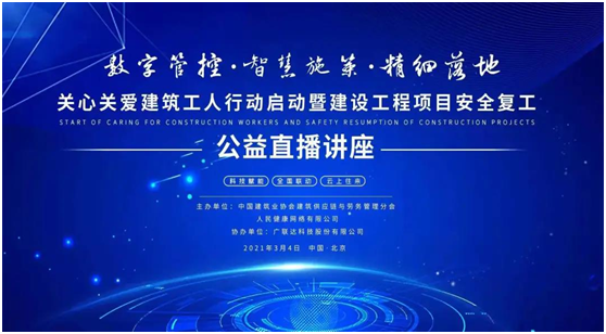 3月4日,由中国建筑业协会建筑供应链与劳务管理分会、人民健康网络有限公司主办,广联达科技股份有限公司协办的“关心关爱建筑工人行动启动暨建设工程项目安全复工公益直播讲座(2021)”成功举办。活动旨在贯彻落实住房和城乡建设部等部门《关于加快培育新时代建筑产业工人队伍的指导意见》,提升企业疫情防控常态化安全意识,加强建筑工人权益保障,增强建筑工人获得感、幸福感、安全感, 推动企业科学有序复工。本次活动得到了住房和城乡建设部建筑市场监管司、各地建筑业协会、广大建筑企业的大力支持和积极响应。会议直播累计观看量达24000人次。