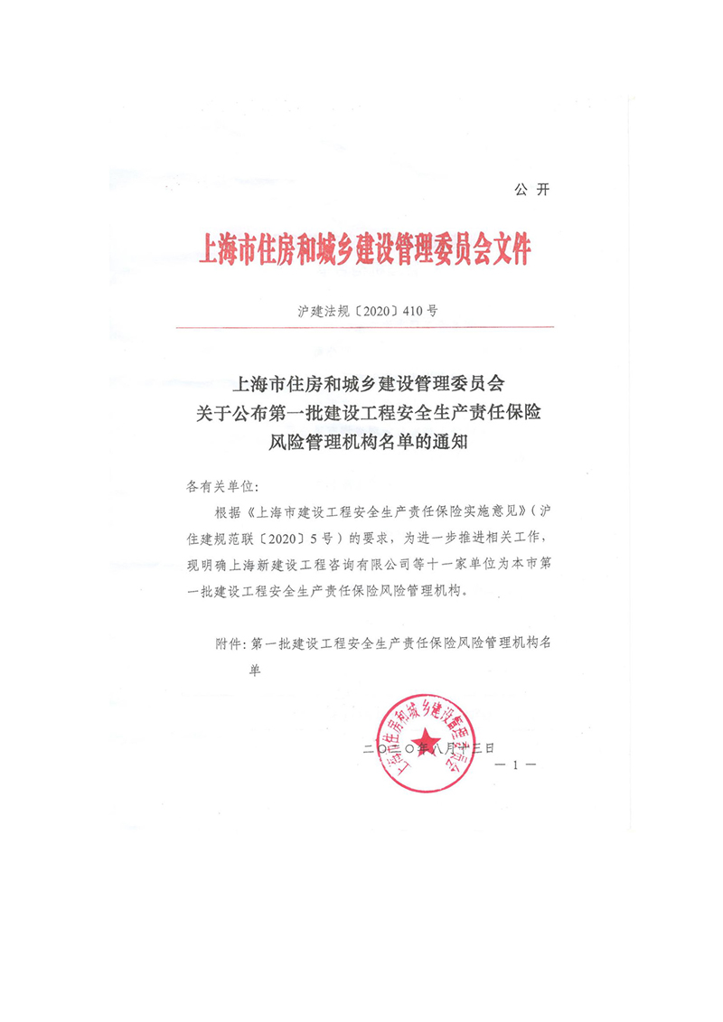 上海市住房和城乡建设管理委员会关于公布第一批建设工程安全生产责任保险风险管理机构名单的通知